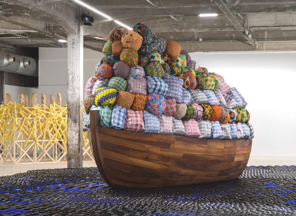 One artwork of his that hits me hard is “Road to Exile”, a monumental installation that speaks directly to the perilous journeys many migrants and refugees endure. the piece features a life-sized wooden boat, piled high with bundles of fabric wrapped in bright, african patterns. These bundles are not just luggage but memories, belongings and lives in transit. the boat itself is precariously balanced on a bed of broken glass bottles, a symbol of the danger, fragility, and instability of the journey. The bottles represent the risk of capsizing, of harm, the sharp obstacles that migrants face along the way.