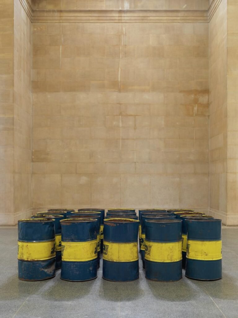 One artwork that has stayed with me is “The Third Choir”. It’s a monumental installation consisting of 20 oil barrels paired with 20-channel stereo audio, arranged in a large display. The barrels are industrial, heavy, and rigid, yet their placement and the accompanying sound create a delicate, almost fragile rhythm with the audio producing overlapping ethereal tones that move through the gallery space. The barrels are aligned in a grid-like formation, but subtle gaps and offsets give each one room to “breathe”.