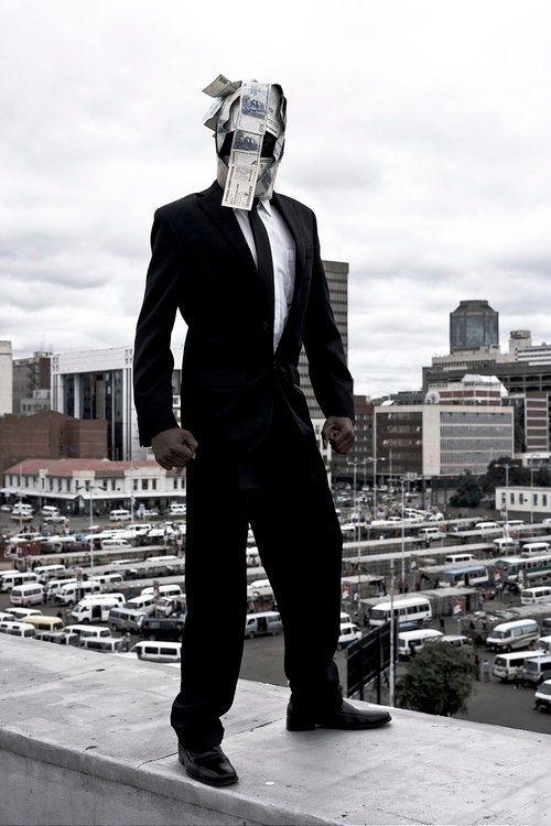 One artwork that resonates deeply is “Ndiri Cross Border Trader (I Am a Cross Border Trader)”. It depicts Machona himself performing as a cross-border trader. He uses old Zimbabwean notes to create masks and costumes. The money is no longer currency, but it carries histories of trade, value, and instability. The masks themselves are haunting. They seem to speak of identity in movement, of people navigating a world where value shifts and survival is precarious. The work as a whole feels performative, like it’s waiting to be worn. The repetition of the notes builds rhythm, and the intricacy shows both labor and care. He stands in urban or border landscapes, embodying the strategies, visibility, and resilience required to navigate precarious systems. The reflective tape shimmers under light, referencing caution, danger, and survival, while the fabrics assert cultural identity and personal presence.